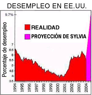 La predicción nº 5 de Sylvia, que en julio/04 el desempleo alcanzará un record histórico antes de disminuir por la llegada de una nueva tecnología en Texas y Nevada, es absolutamente descabellada. La probabilidad de que esto ocurra es casi nula, aunque más no sea que porque la primera parte es patentemente ridícula.
