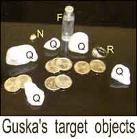 La especialidad de Mike es encontrar oro y las pruebas estaban elaboradas con este fin. El material que él había escogido, y que había traído consigo estaba compuesto de cinco piedras de cuarzo, nueve monedas “Sacagawea” de dólares, un anillo de oro, una pepita de oro, y un frasco pequeño con agua y unas pocas escamas. Dijo que siempre había tenido éxito detectando cada uno de estos 17 elementos cuando su palo bifurcado estuviera especialmente “afinado” para captar oro - que se logra poniendo un pedacito de oro en la punta del palo. Este es un reclamo común de los practicantes de radiestesia, que su palo/barra/péndulo es sensible a la substancia con la que esté conectada. Decidimos usar todo el paquete con los diecisiete artículos, sellado en una bolsa plástica, para darle a Mike la oportunidad máxima de encontrarlo, y él ató su muestra de oro como su “guía” para así “afinar” su vara. El peso total del paquete era de 230 gramos (8.2 onzas).