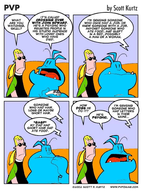 El ilustrador Scott Kurtz, quien contribuye en la página de “juegos” en http://www.pvponline.com, publicó la tira cómica que ven aquí, el primero de abril. Su personaje, Skull el Troll, es una criatura ingenua que tiende a aceptar y a creer en lo que sea. ¿Dónde he visto yo características similares?…Otro personaje, Brent Sienna, reconoce a Edward como el fraude que es y trata de mostrarle a Skull lo frívolo que es el espectáculo de Edward.