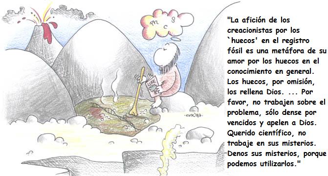 Es completamente ilógico exigir una documentación completa de cada paso de cada narración, tanto en evolución como en cualquier otra ciencia. Sólo una pequeña parte de los animales muertos se fosilizan, y tenemos suerte de tener todos los fósiles intermedios que tenemos. Podríamos perfectamente no tener ningún fósil, y la evidencia de evolución de otras fuentes, como la genética molecular y la distribución geográfica, sería todavía abrumadoramente contundente. Por otro lado, la evolución produce la firme predicción de que si aparece un solo fósil en un estrato geológico equivocado, la teoría sería echada por tierra. Cuando un entusiasta popperiano le desafió a decir cómo podría falsarse la evolución, J. B. S. Haldane gruñó famosamente: “Conejos fosilizados en el precámbrico”. Nunca se han encontrado fósiles anacrónicos así, a pesar de las desacreditadas leyendas creacionistas sobre cráneos humanos en las vetas de carbón y huellas humanas entremezcladas con huellas de dinosaurio. La afición de los creacionistas por los ‘huecos’ en el registro fósil es una metáfora de su amor por los huecos en el conocimiento en general. Los huecos, por omisión, los rellena Dios. ¿No se sabe cómo funcionan los impulsos nerviosos? ¡Bien! ¿No se comprende cómo se guardan los recuerdos en el cerebro? ¡Excelente! ¿La fotosíntesis es un proceso misteriosamente complejo? ¡Maravilloso! Por favor, no trabajen sobre el problema, sólo dense por vencidos y apelen a Dios. Querido científico, no trabaje en sus misterios. Denos sus misterios, porque podemos utilizarlos. No desaproveche la ignorancia investigando para eliminarla. La ignorancia es el regalo de Dios a Kansas.